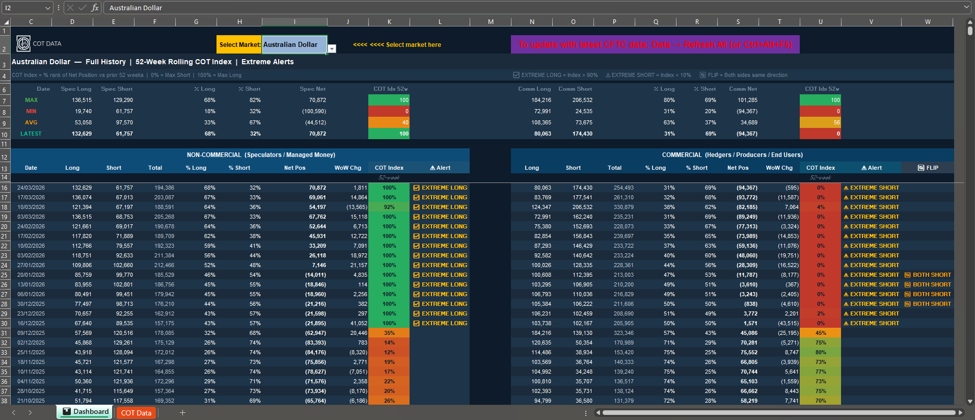 It is not a trading system and it does not generate signals automatically. It gives you the data, organised and calculated, so you can apply your own analysis. The web dashboard at cotdata.net is free and covers the same data — the Excel file is for people who want to work with it directly.